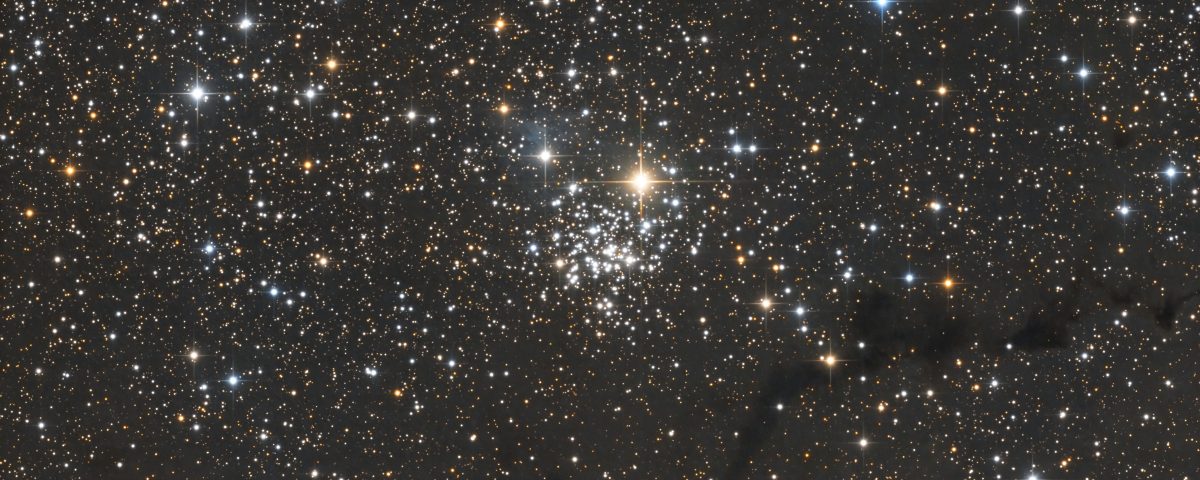 The star identified as HIP 8074 floats not far from the main body of the cluster and it has been determined that it’s not a member of NGC 654. However, this A-type giant star attracts attention by its bluish reflection nebula – vdB 6 – a reminder of the nebulosity surrounding the Pleiades. In deeper images, one may also discern a void in the starry background meandering from E to W, almost north of the cluster. This is a dark nebula composed of 3 LDN objects (1332, 1334, 1337) which adds to the complexity of the region.