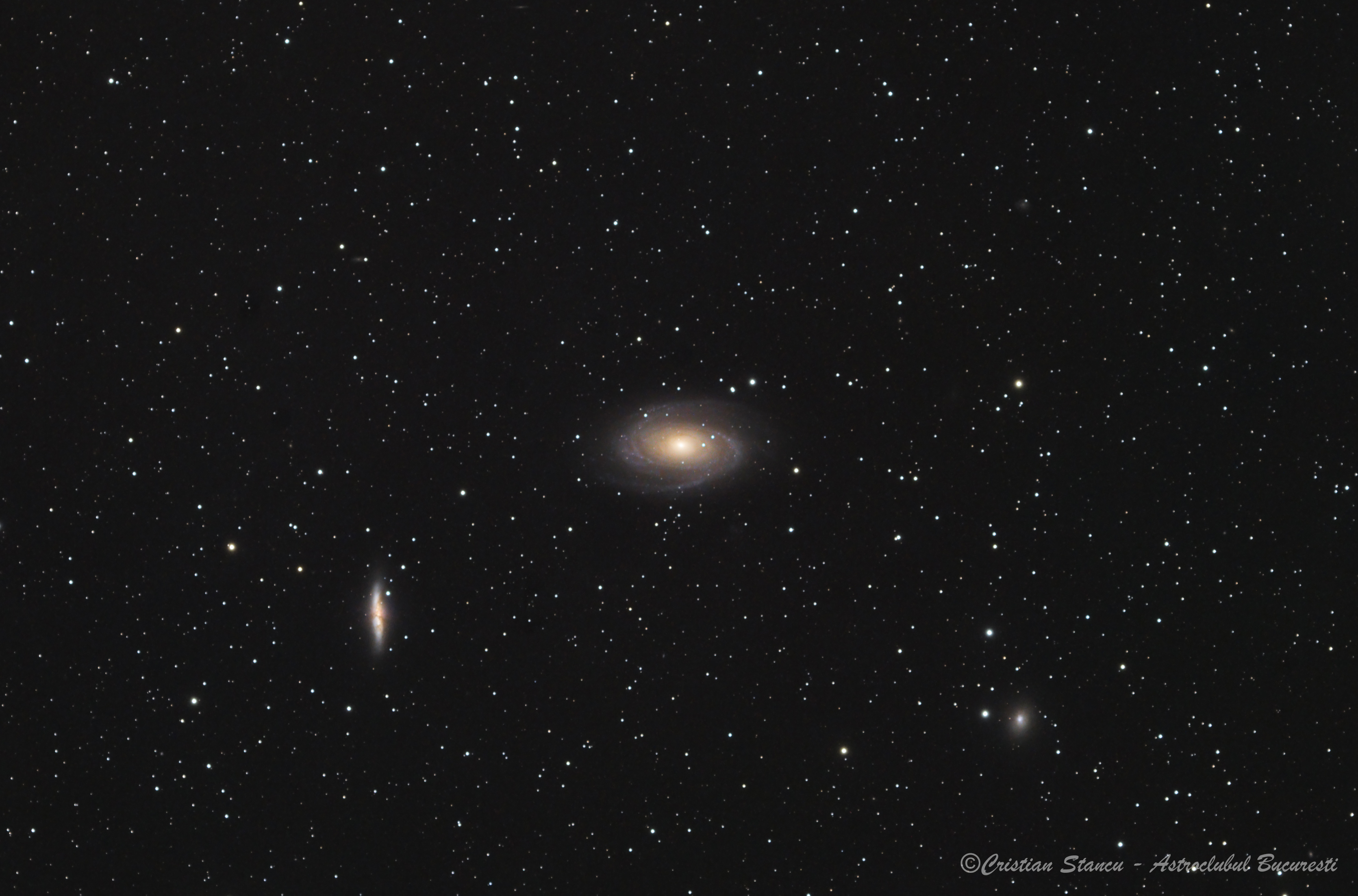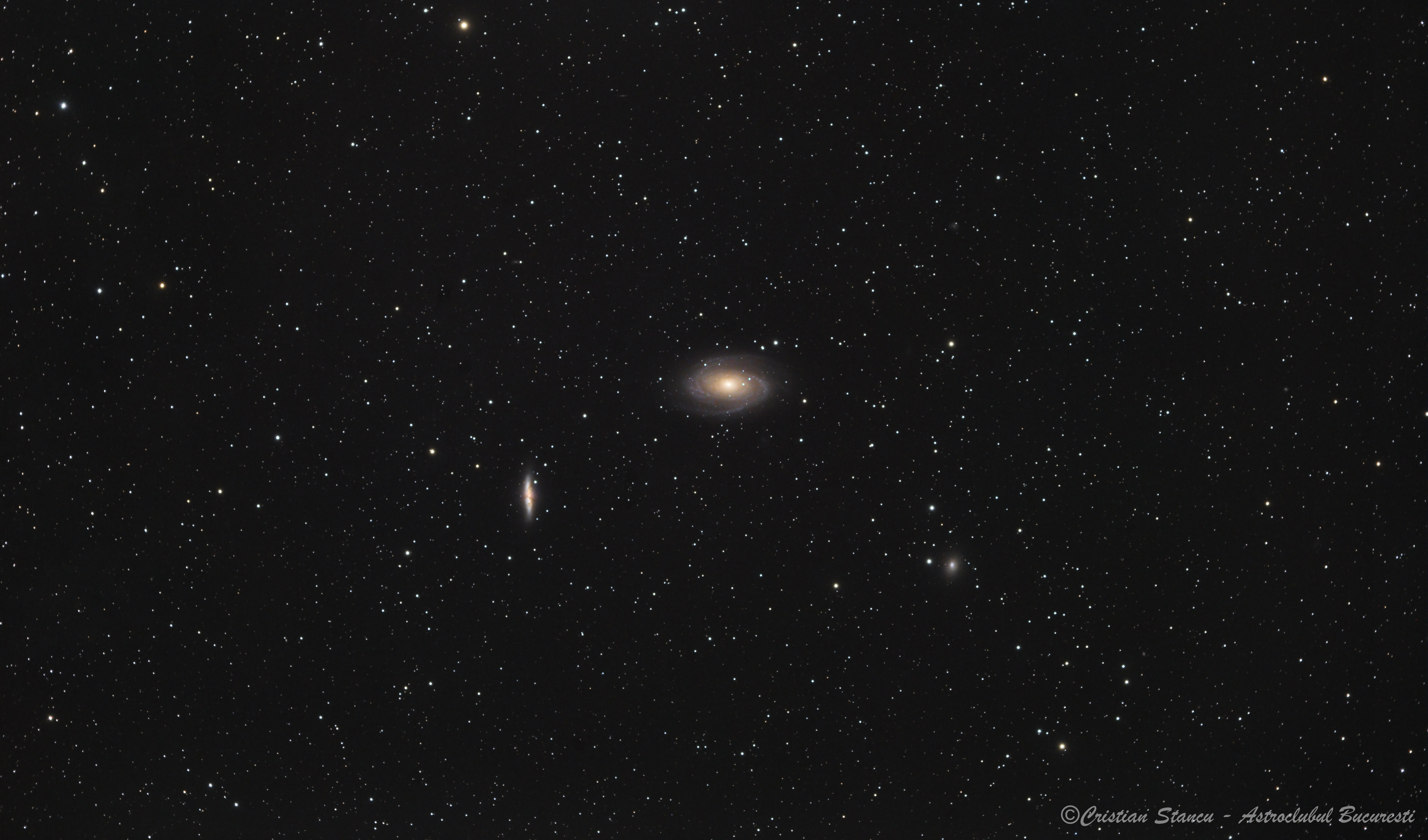 – galaxia spiralată Messier 81 (Bode’s Galaxy) în partea de sus;